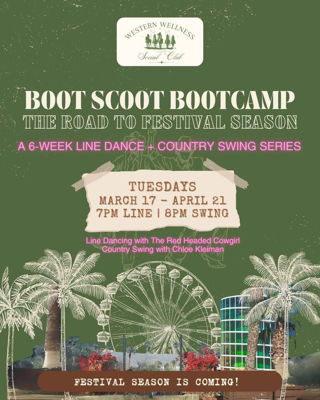 This 6-week line dance + country swing series is led by Red Headed Cowgirl and Chloe Kleiman, two incredible instructors bringing their passion for line dance, partner work, and welcoming community energy to the floor. Together, they’ll guide you through the foundations of country dancing in a supportive studio environment where you can actually learn, practice, and build confidence.
